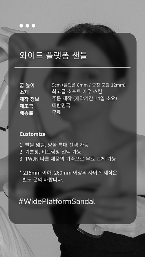 와이드 플랫폼 샌들은 전체적으로 볼드한 쉐입으로 구성되어 발을 더 아름답게 만들어 주는 샌들입니다. 라운드 형태의 중창에 발볼과 발등을 넓게 감싸주기 때문에, 발을 완전하게 드러내는 것에 부담이 있다면 도움이 될 것입니다. 8mm의 히든 플랫폼(중창, 창 포함 12mm)은 단순히 세련된 것에 그치지 않고, 발 전체에 안정감을 더해주는데요.